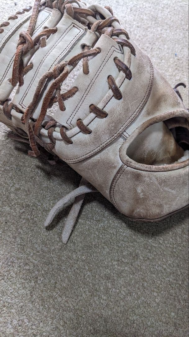 - ファーストミット、長くて型崩れしやすいのですが、ボールをはさんでこのベルトでとめるとキレイな形を保つことが出来ます。簡単ですしおすすめ!!